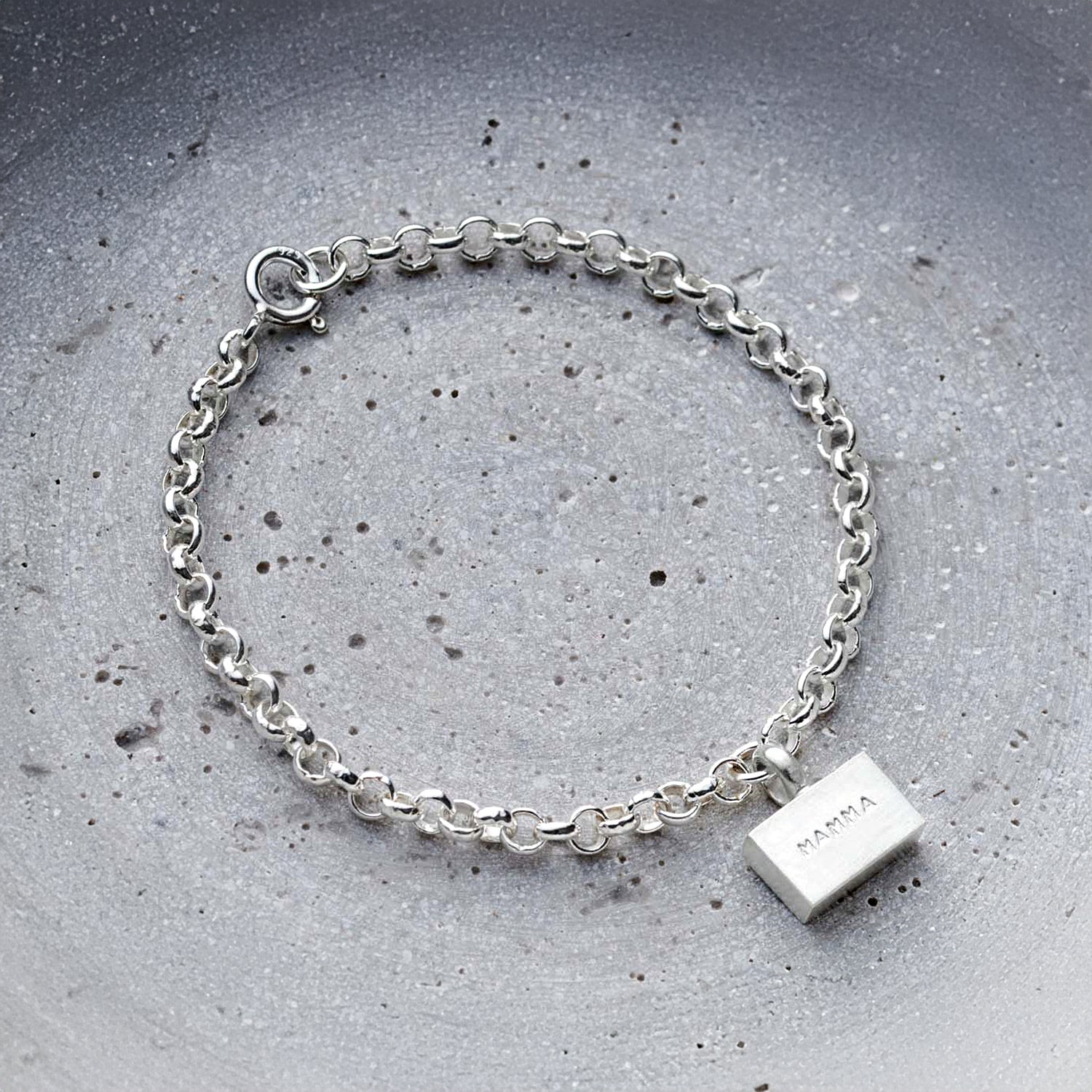 Each silver brick charm is hand stamped in our Yorkshire studio with your choice of name, date or message. No machines here, just hammer and steel punches, so every letter lands with its own character. The result is a bracelet that feels personal.