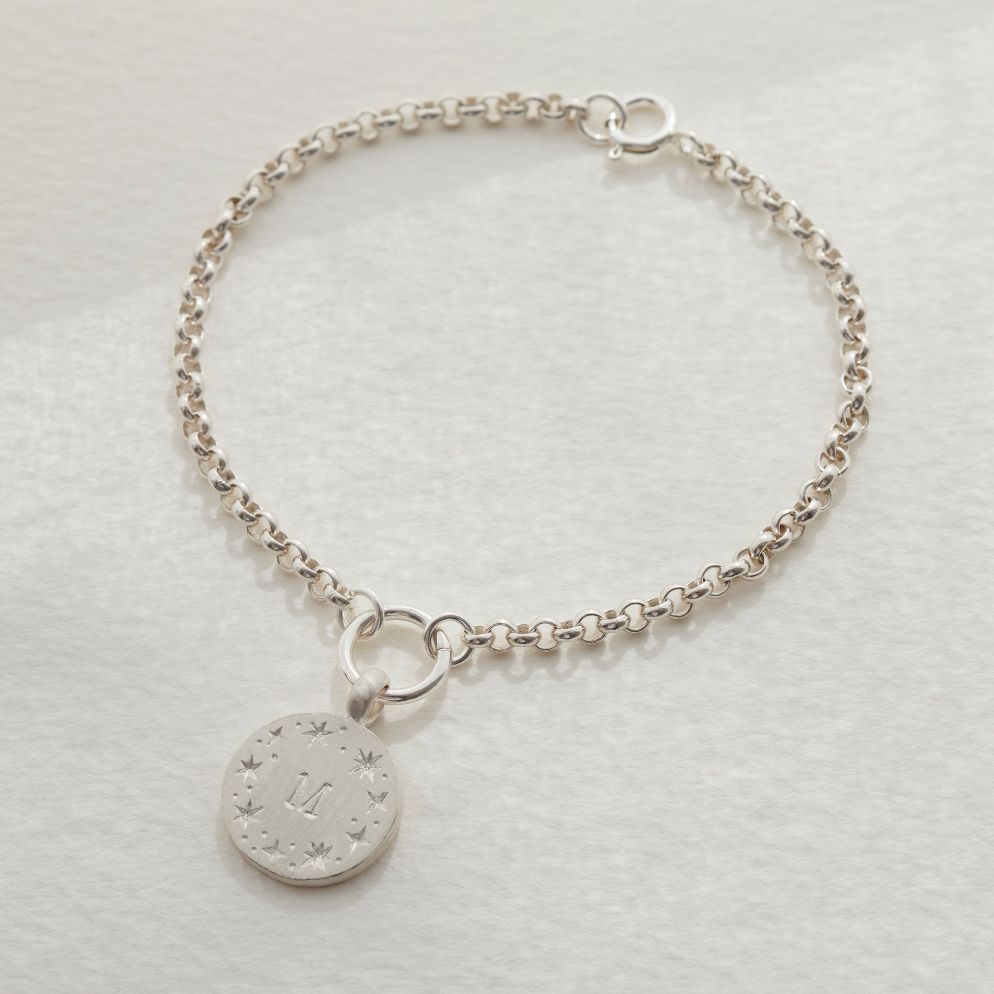 It hangs from a sterling silver charm catcher, fixed to the rolo chain, so you can add more charms over time or keep it simple. A thoughtful gift or piece to mark a special occasion, this bracelet is designed to keep yours or your loved ones star sign and initial close.