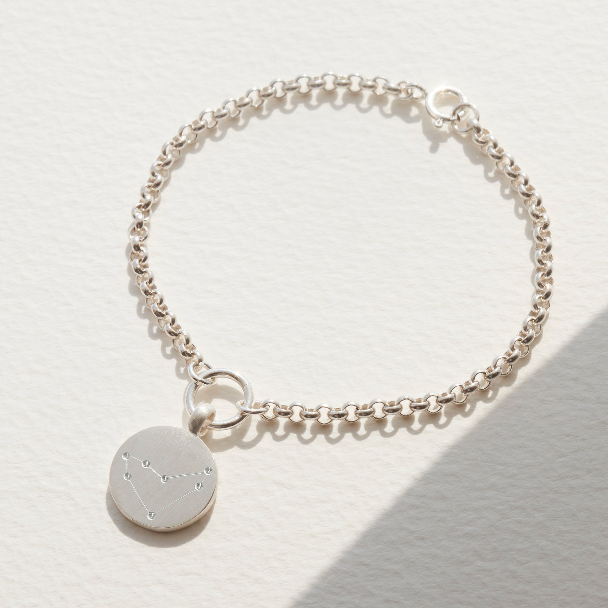 A zodiac initial bracelet with two sides, made to be worn every day. The solid silver charm is reversible: one side is stamped by hand with your chosen initial, framed by a smattering of stars, while the other side features your zodiac constellation neatly engraved into the surface.